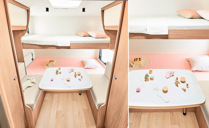 Séparé de l’avant du véhicule par une cloison de séparation, celui-ci est doté de deux lits superposés transversaux. Une dinette avec banquettes face à face permettra à vos enfants de disposer de leur propre espace.